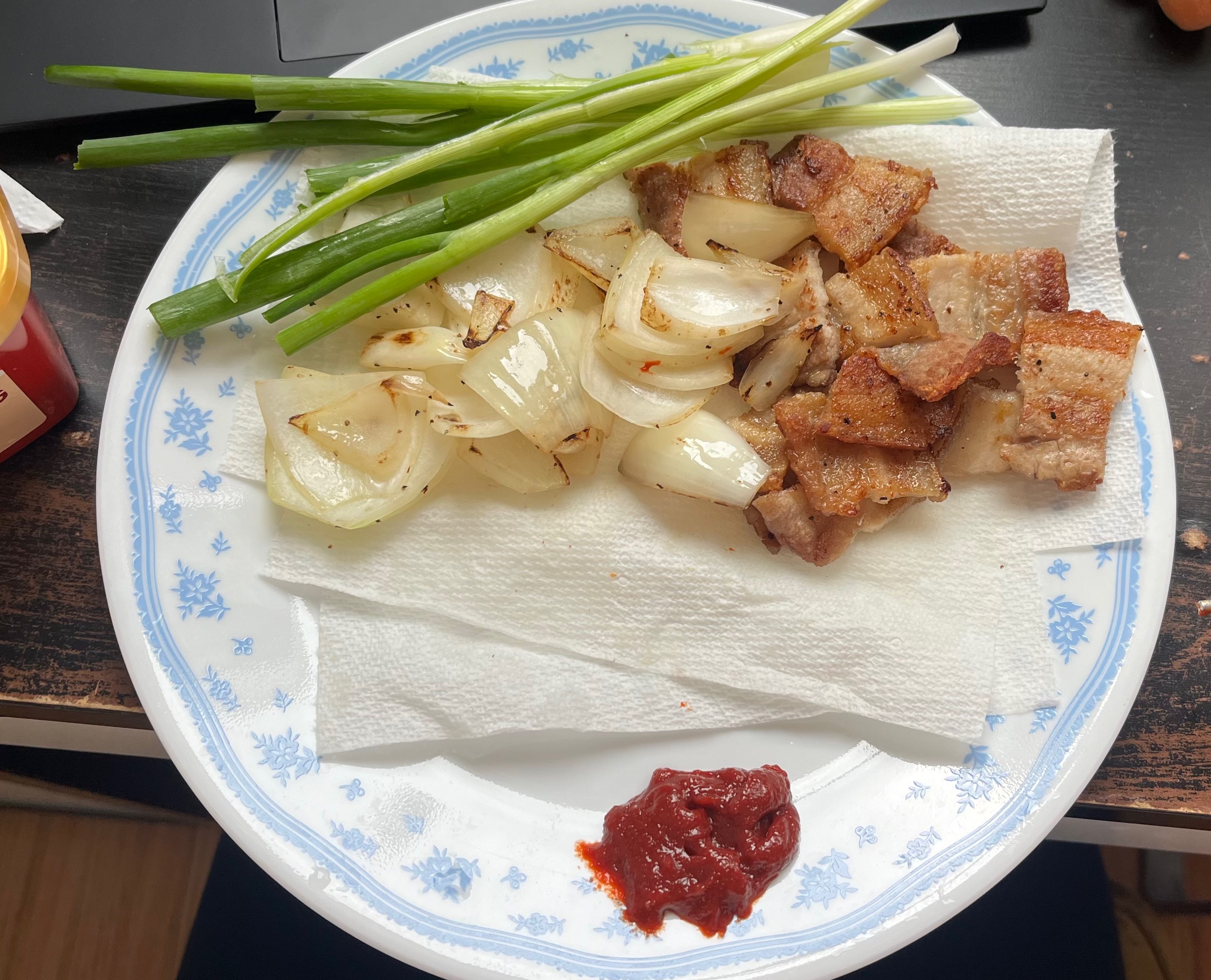 한인마트에서 사 먹은 삼겹살에 미치진 못한 맛이었다. 딱히 감칠맛도 없고 그냥 무맛 삼겹살이었다. 그냥 고기로 태어난 고기.. 대충 익히다 만 양파와 생 파를 함께 곁들여 먹으니 너무 맛있었다.